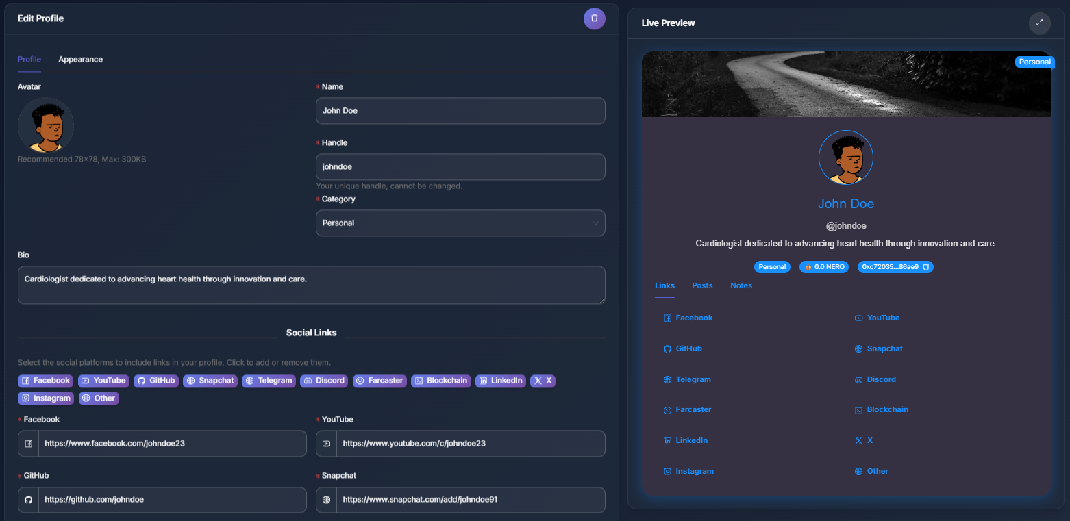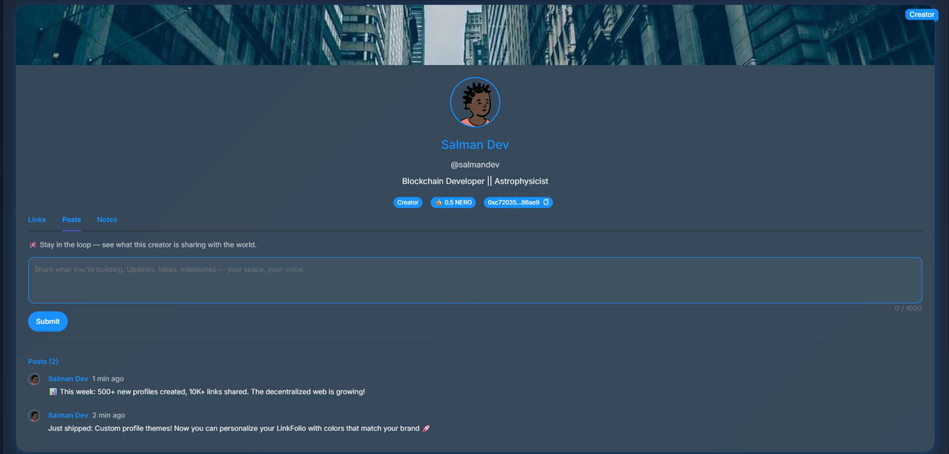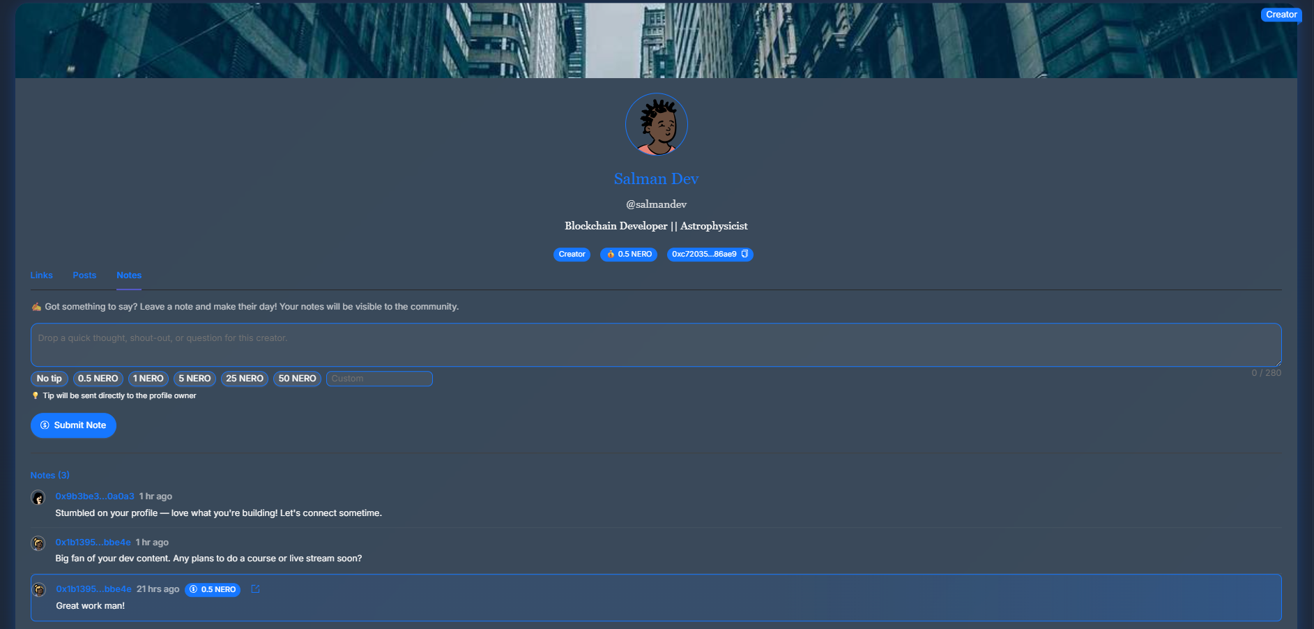 Build your professional profile as a soulbound NFT with on-chain metadata. Share links, receive tips, and connect with your audience on the decentralized web.